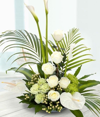 A magnificent floral centrepiece. Pure white Roses and elegant Arum and Anthruium Lilies nestled in amongst Chrysanthemums and Carnations. Exquisitely arranged with a touch of Hypericum and a flourish of Palm.